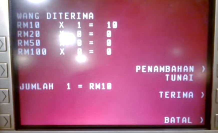 - Skrin akan memaparkan jumlah duit, tekan Terima/YA jika betul. Sekiranya salah tekan BATAL.