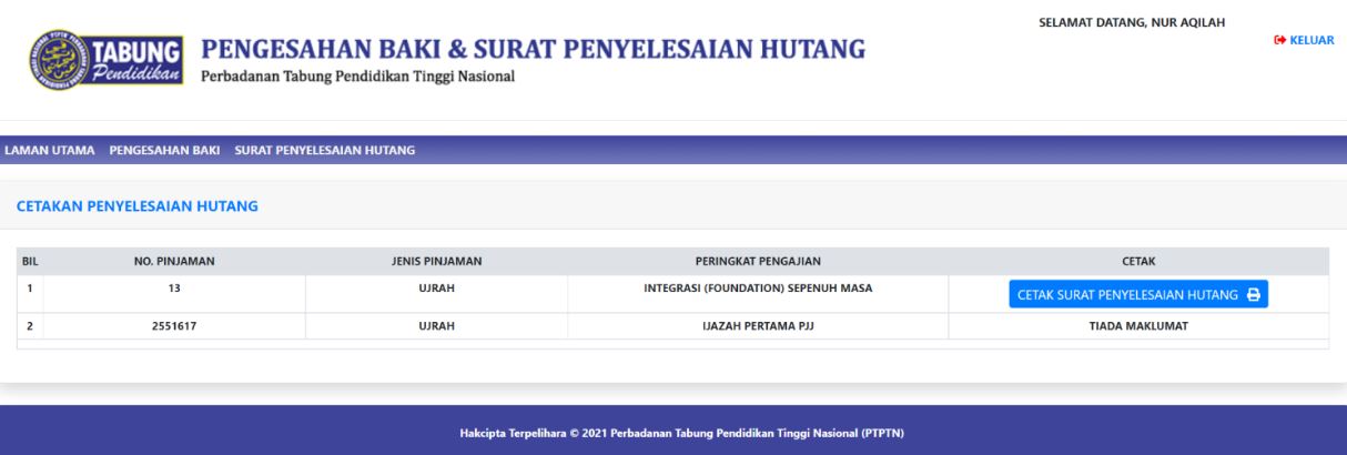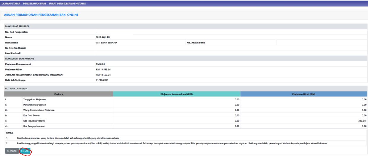 - Paparan cetakan suran penyelesian hutang, sila klik Cetak Surat Penyelesaian Hutang
